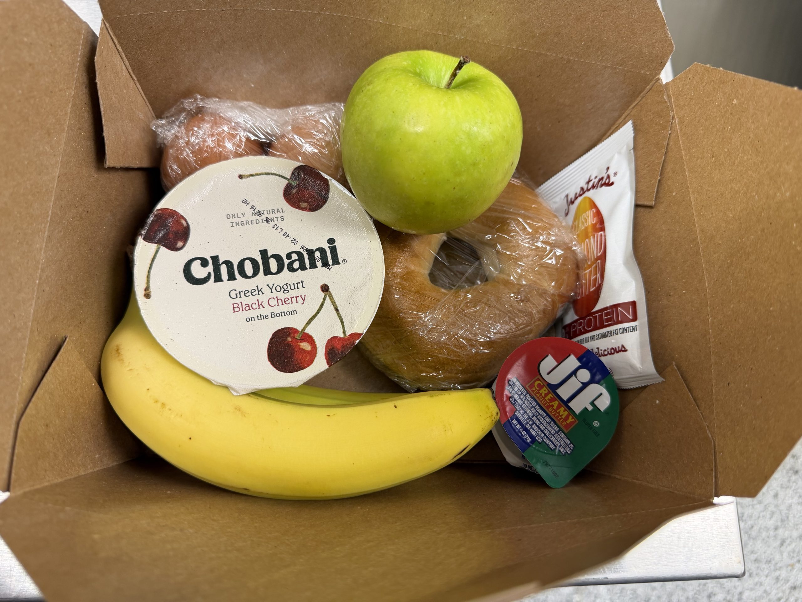 1 bagel, cream cheese, peanut butter, almond butter, 2 bananas, 2 boiled eggs, and a cup of Greek yogurt