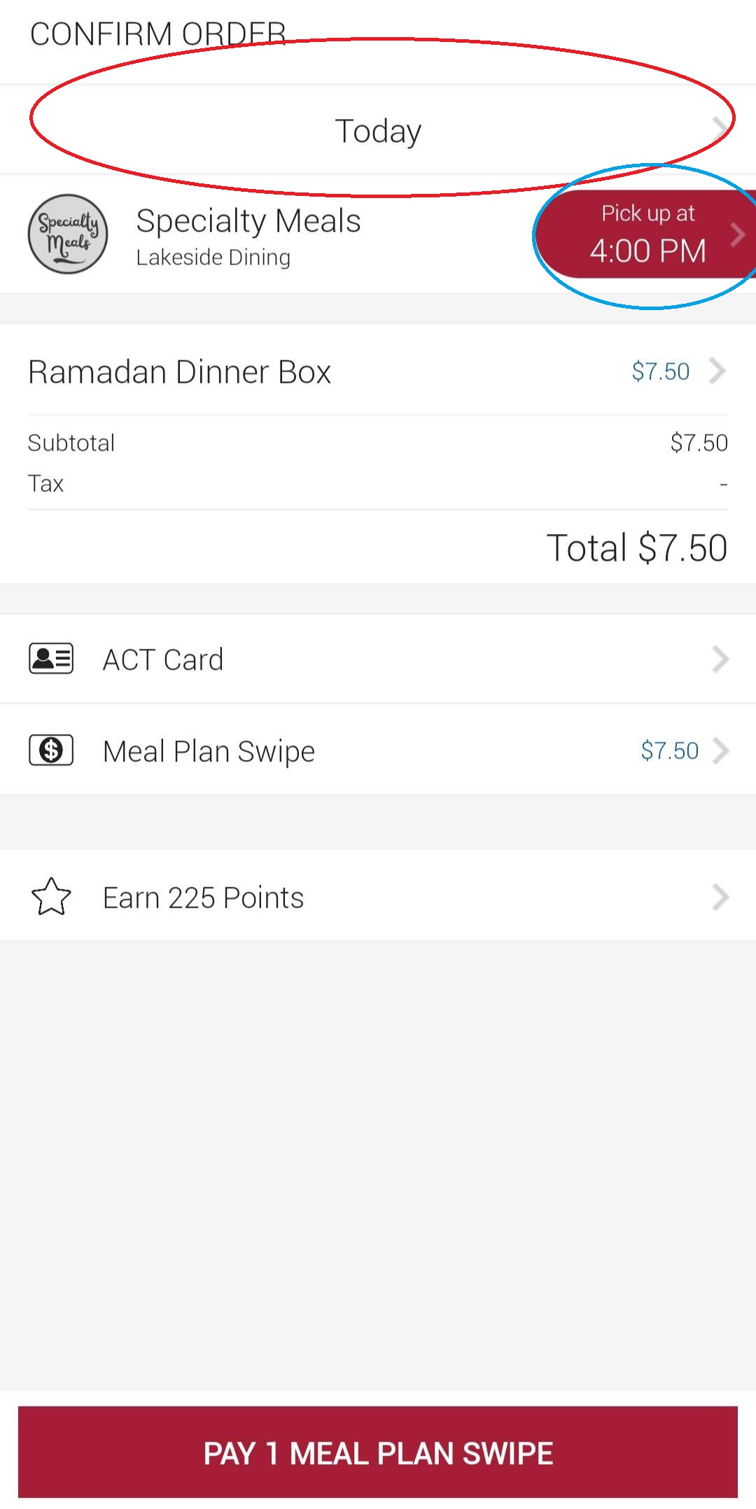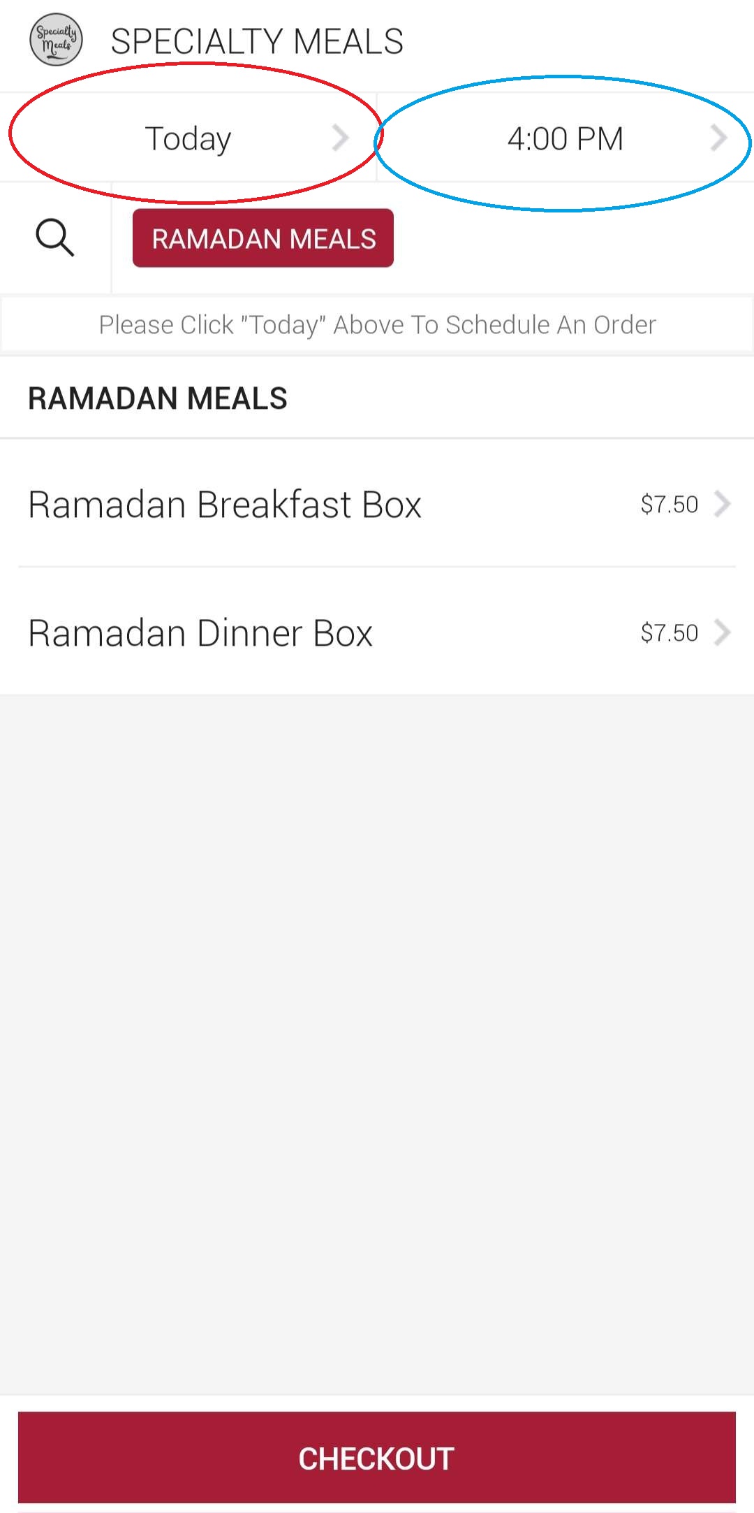 When going into the Specialty Meals Location, you can click on the Today button, circled in red, to set your pickup day to tomorrow. Additionally, you can set your pickup time by clicking the button under the blue circle.